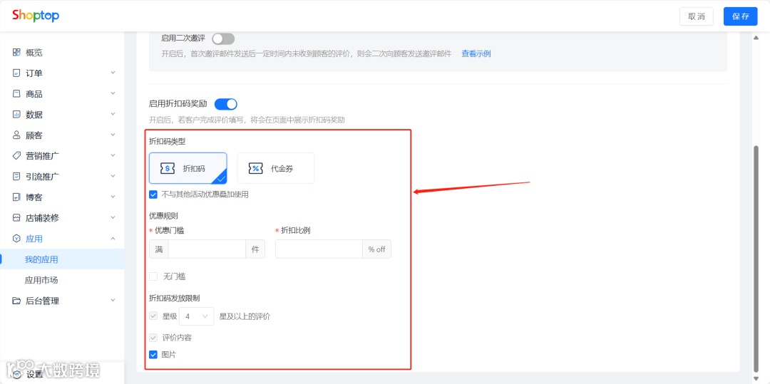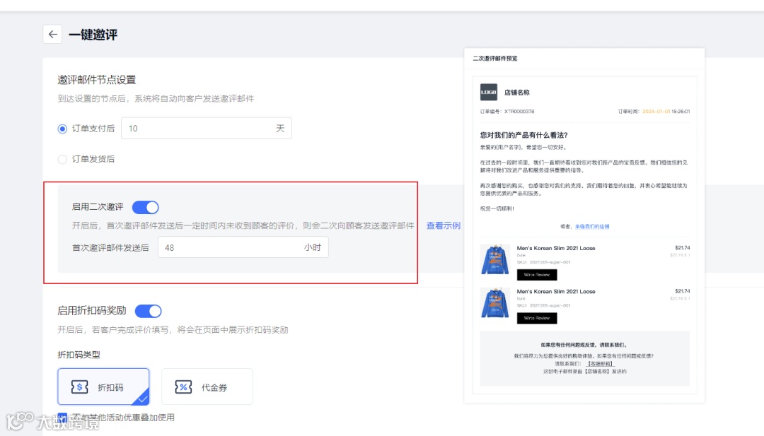 借助Shotop「一键邀评」,可使用折扣码或代金券等奖励形式,吸引用户参与评论,提高邀评成功率,另外,领取折扣券的用户,极大可能会进行品牌复购,进一步提高店铺收益。