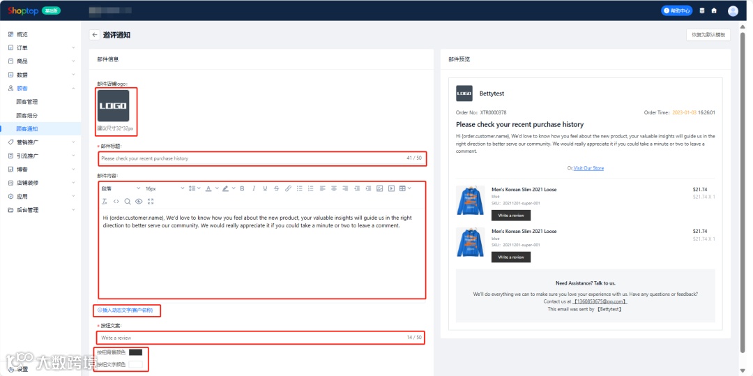 Shoptop卖家可以首次设定邀评邮件模版,通过个性化模版样式,自定义logo、邮件标题、内容,按钮文案、颜色等,打造个性化品牌邀评特色,给消费者留下深刻印象和记忆。