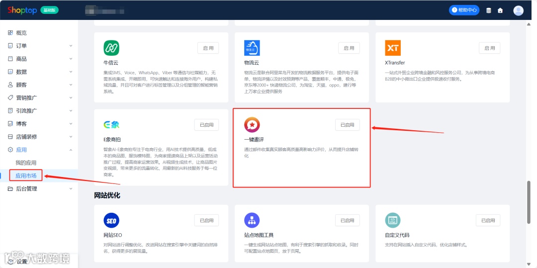 入口:【Shoptop后台】—【应用市场】—【一键邀评】。