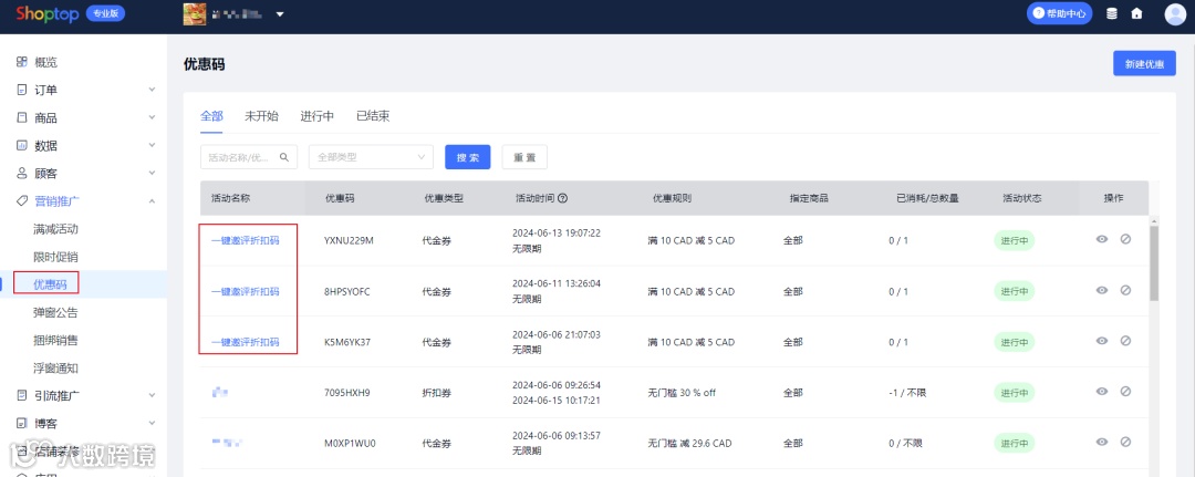 您可以通过Shoptop后台中:【营销推广】—【优惠码】查看折扣码的领取情况。