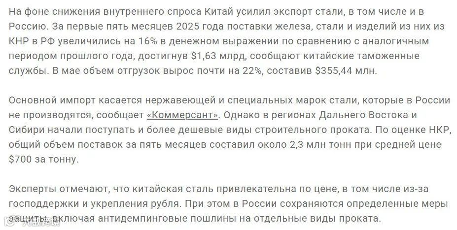 同期,中国对俄钢材出口总量约为230万吨,均价维持在700美元/吨。据俄罗斯《生意人报》分析,进口结构呈现差异化:不锈钢及特种钢材因本土产能不足仍依赖进口;远东和西伯利亚地区则大规模采用中国建筑用轧钢制品,得益于其显著的价格优势。