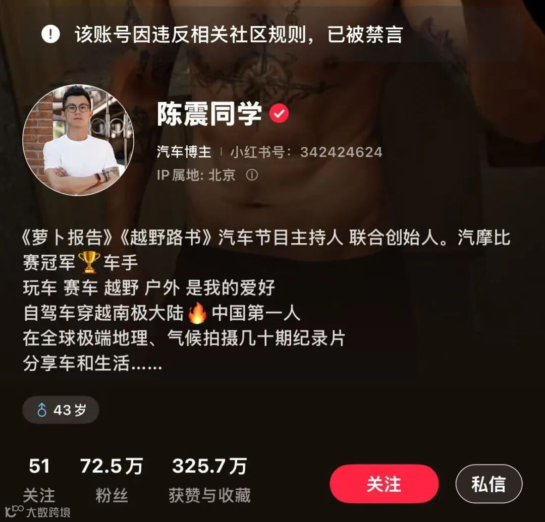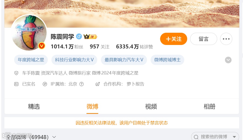 导读:知名车评人陈震在包括微博、抖音、B站、小红书等在内的多个平台被禁言。