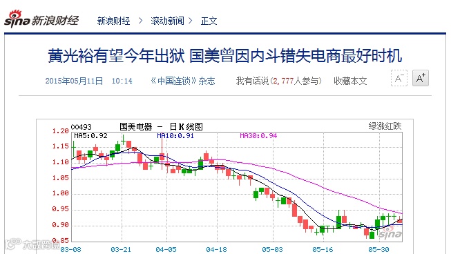 据悉,《国美静候黄光裕归来》这边文章发布后在网上迅速传播,在传播过程中,文中原本对黄光裕出狱持猜测性的观点和疑问渐渐演变为肯定的确切的消息。新浪网转载时甚至将《国美静候黄光裕归来》原标题直接改为“黄光裕有望今年出狱,国美曾因内斗错失电商最好时机”,并被多家媒体转载。在大量消息的推动下,国美三家关联公司(山东金泰、三联商社、中关村)股票价格闻风而动。2015年5月11日至14日停牌,三联商社累计上涨35.07%。2015年5月11日至15日,山东金泰累计上涨29.78%;中关村累计上涨17.66%,都与同期上证综指、深证综指涨幅偏离幅度较大。