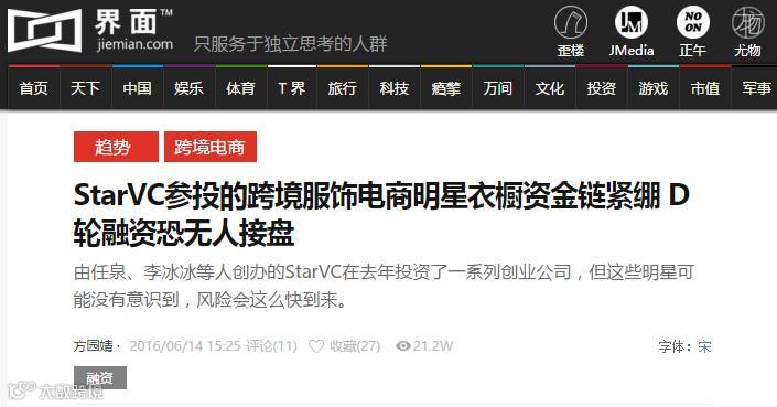 方园婧在《背后》文中提到,她是在接到一条关于“‘明星衣橱’公司多次拖欠工资和社保”的爆料后,随即进行了取证调查。在确认这一事件属实后,才在界面发表了《StarVC参投的跨境服饰电商明星衣橱资金链紧绷 D轮融资恐无人接盘》。
