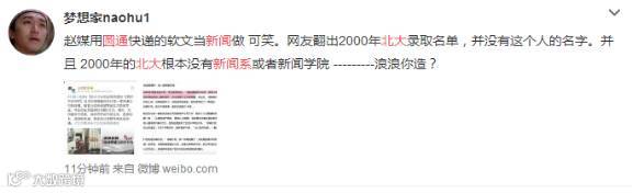 新浪微博认证用户“藏公主-CCTV-” 藏公柱对此事评论道:“假新闻评论个球啊,北大新闻系1961并入人大,2001正式复建,徐璐2000就考进?中央台纪录频道2012年才开播,频道还没诞生,她就在空气中意淫工作?该文许多信息造假,缺乏常识,违背逻辑!不信者可以查证,成都商报也成地沟油了?”