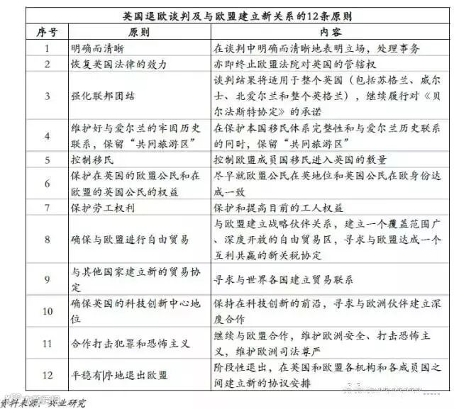 下图为英国退欧谈判与欧盟建立新关系的12条原则与主要内容。