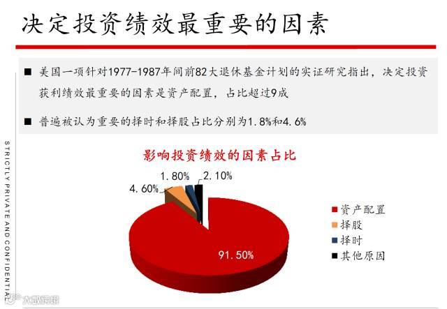 我们经常说投资组合,影响投资组合绩效最重要的因素是什么?其实就是资产配置。这个数据大家应该耳熟能详,我们还是再稍微重复下。我希望大家作为从业人员,在面向客人的时候不断的灌输,长期看会有潜移默化的影响。资产配置确实决定了这个投资组合的绩效九成以上。另外长期大家认为有影响的择时和择股这两个因素其实分别占比1.8和4.6,这个对组合的影响几乎可以忽略不计。这是一个重要的结论。