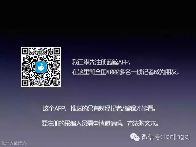 注册前请联系蓝鲸小秘书索要邀请码,QQ:1729572640,个人微信lanjingxms。还可联系蓝鲸助理个人微信lanjingzhuli申请邀请码。备注姓名+单位(必须是大陆地区在职财经记者/编辑才可申请注册哦)