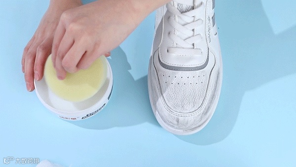 海绵在膏体上蹭一蹭,在原本脏了的小白鞋上轻轻来回擦拭,哇,脏污渍一下子消失了。