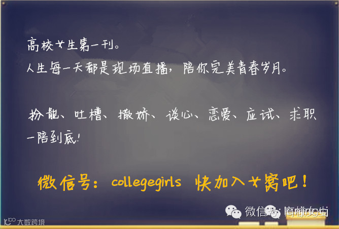 导读:微信推荐:高校女生(ID:CollegeGirls)人生每一天都是现场直播,陪你完美青春岁月。扮靓、吐槽、撒