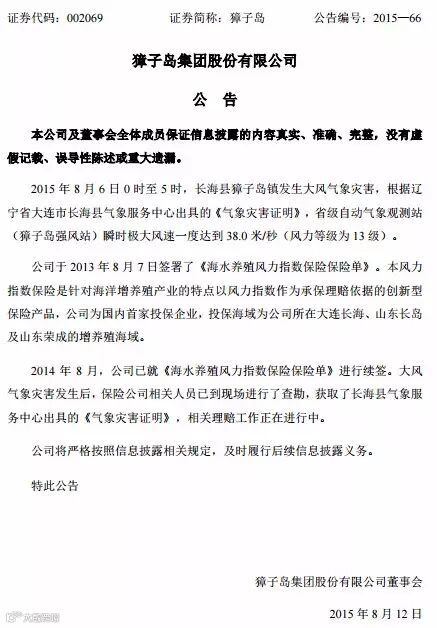 公司公告称,8月6日凌晨獐子岛镇遭遇瞬时13级风力的大风,大连市长海县气象服务中心出具了《气象灾害证明》。