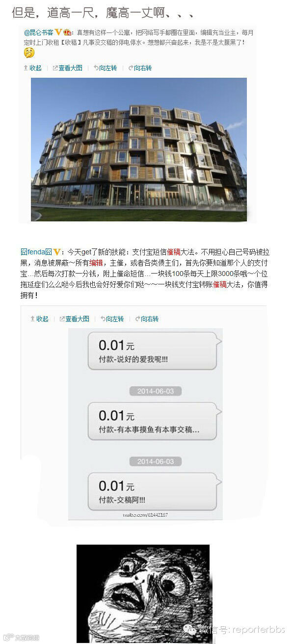 据闻客了解,上述情况都是发生在《XXXX报》两位记者的身上,一记者结婚遭编辑催稿,红地毯悲催的“火“了;另一位女记者,迎来新生儿的喜悦时,还没喘过气来,接到了编辑的催稿电话,顿时表情僵硬。。。类似的经历还有许多。请往下拉↓↓(论坛君表示,也听到过上述江湖传说。)