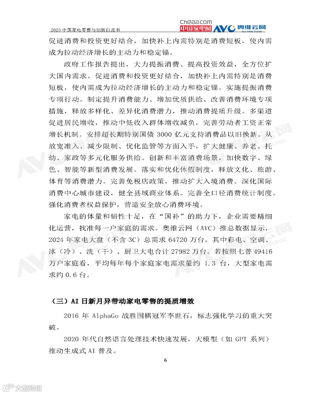 在快速变迁的家电市场中,如何把握趋势、创新求变,成为每个从业者关注的焦点。《2025年中国家电零售与创新白皮书》深度剖析了中国家电产业的宏观环境、市场逻辑、创新方向及未来趋势,为行业内外人士提供了一份详尽的指南。本报告不仅回顾了家电行业从增量扩张到存量竞争的转型历程,更展望了AI、绿色智能、场景多元化等未来趋势,为家电零售的创新发展指明了方向。