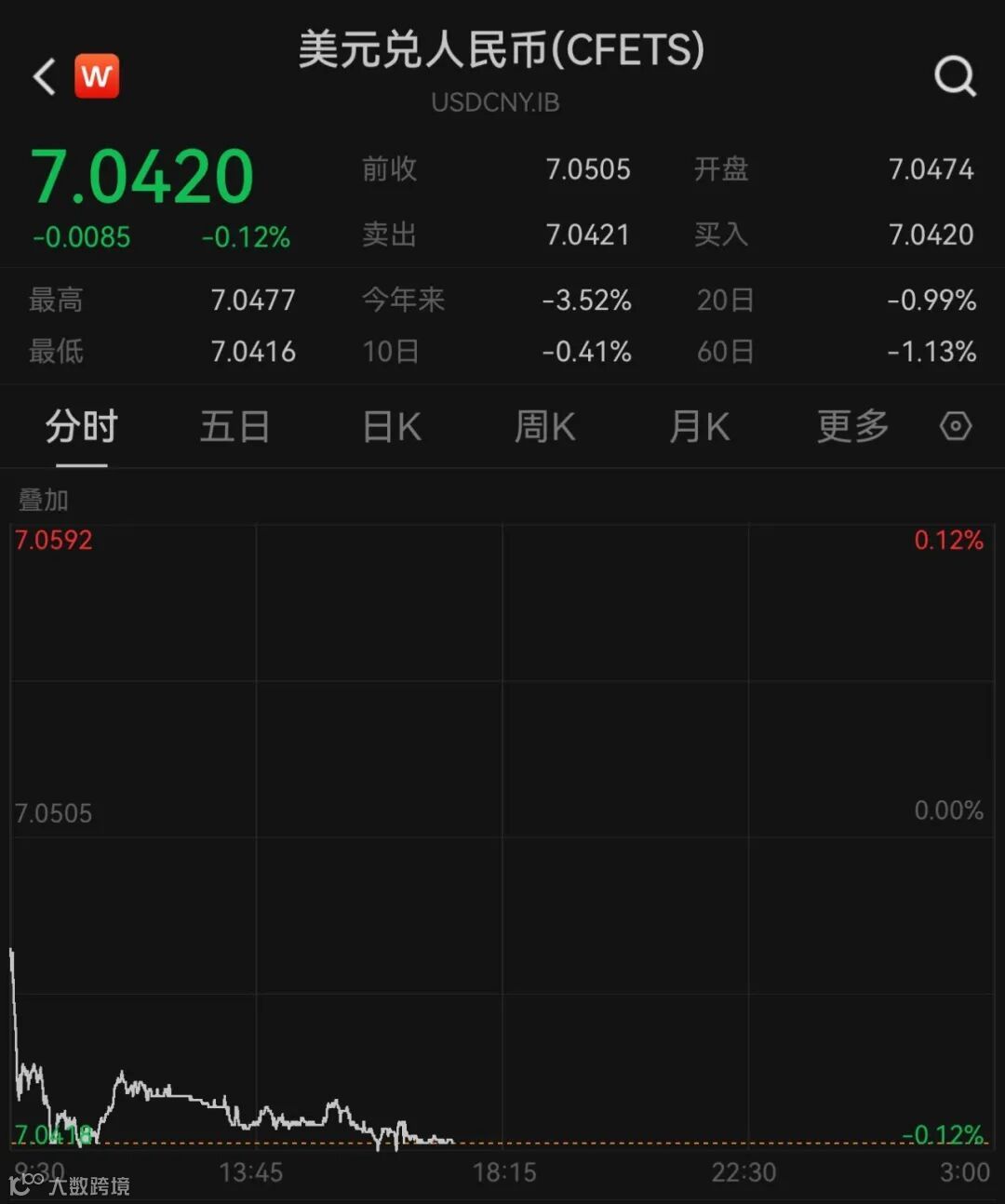 离岸人民币兑美元汇率盘中一度升至7.04,为2024年10月4日以来最高水平,截至发稿报7.03764。在岸人民币兑美元汇率最高触及7.0417,创下2024年10月8日以来新高,报7.0420。