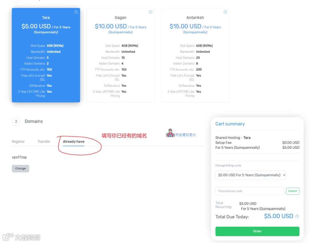 选择一个你要购买的套餐,然后下面填写你已经购买了的域名,如果没有域名也可以直接在他们网站购买,或者参见奶爸建站笔记的域名教程购买。