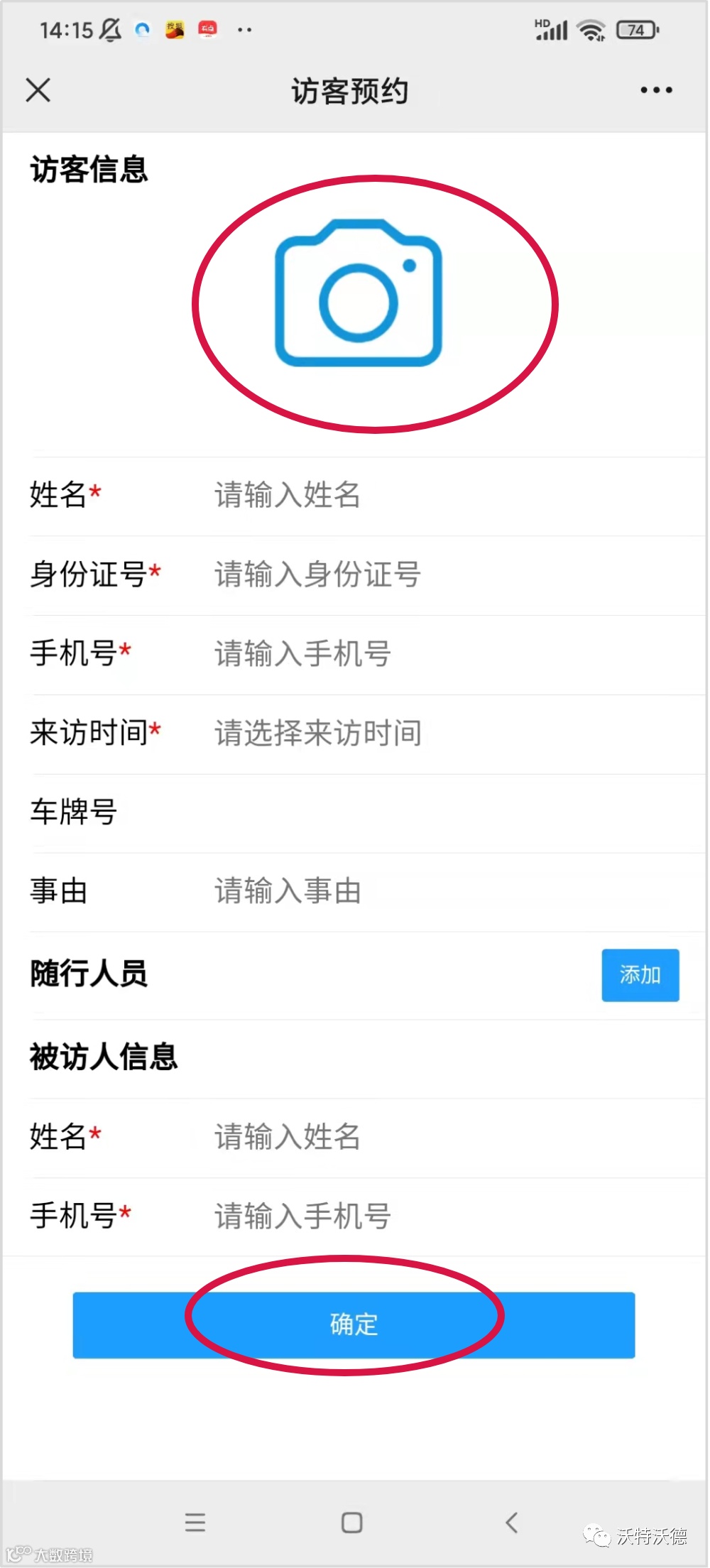 3、在访客预约页面中点击“预约”后上传个人真实照片,真实个人信息,填写被访人真实信息,点击“确定”。