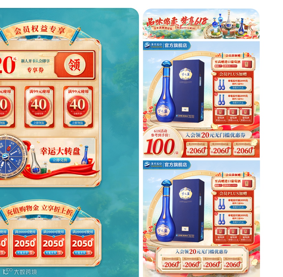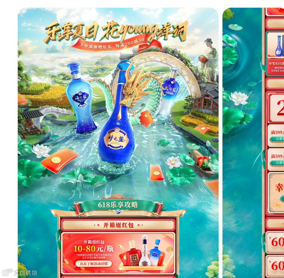 洋河酿酒,传世佳酿。作为中国知名的白酒企业,洋河股份凭借其深厚的文化底蕴、精湛的酿酒技艺和卓越的产品质量享誉国内外。为迎接618大促,洋河股份计划对618大促活动首页进行营销设计,以提升品牌形象,触达更多消费者。