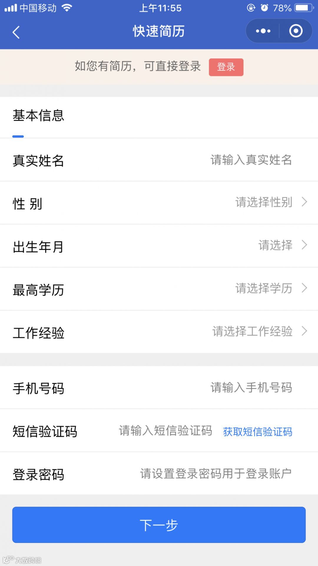 按提示填写简历基本信息
