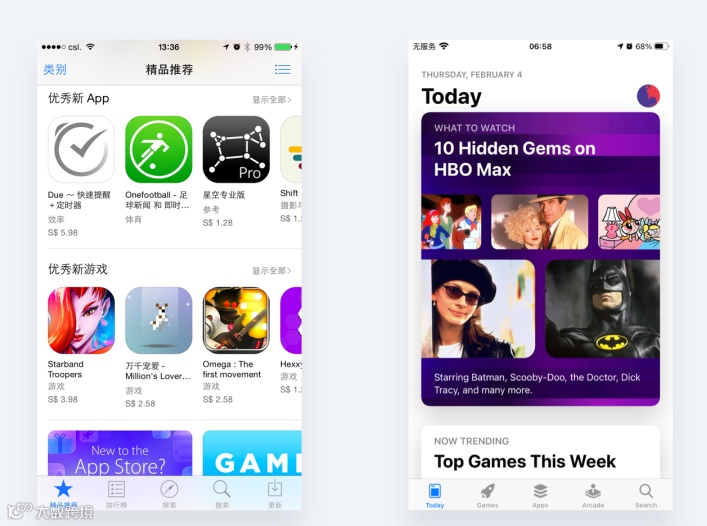 我们将改版前的APP Store首页与改版后的进行比对,发现改版后的界面更加简洁清晰。