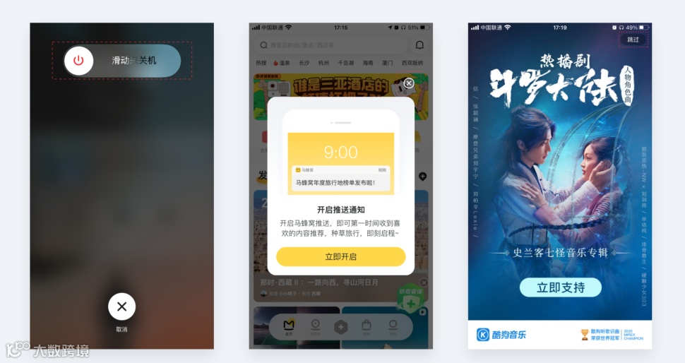 定律的反向使用可以适用一些特殊场景,比如想达到某种目的而降低按钮被点击的可能。例如下图中苹果的关机按钮,采用滑动操作,避免用户误操作。App弹窗经常把“关闭”按钮放在卡片的右上角离手远的地方,目的是希望用户先完成弹窗提示的任务。