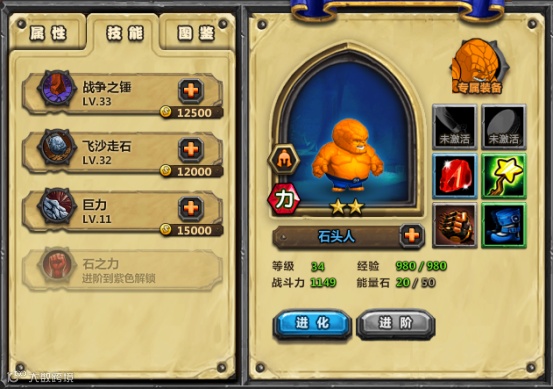 石头人:战争之锤、飞沙走石、巨力、加力量