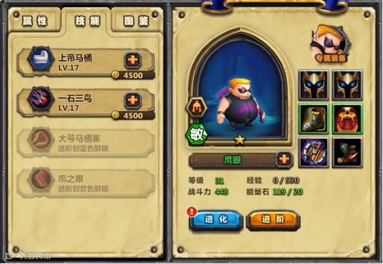 鹰眼的四个技能均为马桶。上帝马桶为释放后向敌人扔巨大的马桶造成群体伤害;一石三鸟向三个敌人发射三个小型的马桶塞;大号马桶塞对一个敌人扔超大号的马桶塞并造成伤害;鹰之眼增加鹰眼的敏捷,增加自身属性。