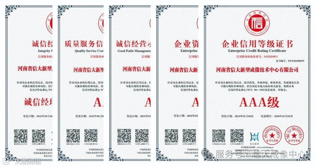 近日,河南省信大新型成像技术中心有限公司在工业检测领域引发广泛关注——企业凭借在X射线无损检测领域的技术突破与卓越服务,一举囊括"企业信用等级AAA证书""诚信经营示范单位AAA认证""质量服务信誉AAA企业"等10项国家级权威资质,创下行业认证大满贯纪录。此次认证覆盖质量信用、诚信企业、商业信誉等六大维度,标志着企业已构建起辐射全产业链的信用生态体系。