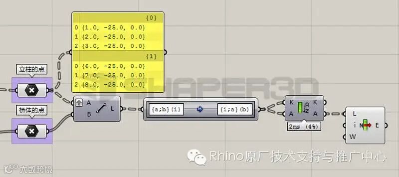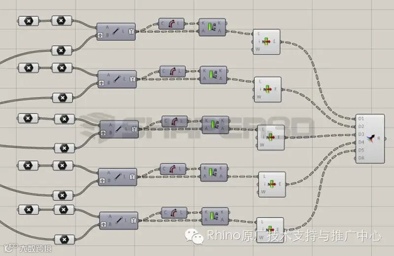 程序处理细节:为了保证输出结果是分组树形结构,因此根据GH的数据对应法则,必须把B端的数据做Graft处理,这样数据的对应方式就变成每个点和顶部的六个点做数据对应连接线。
