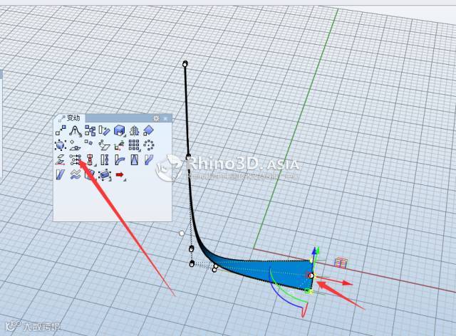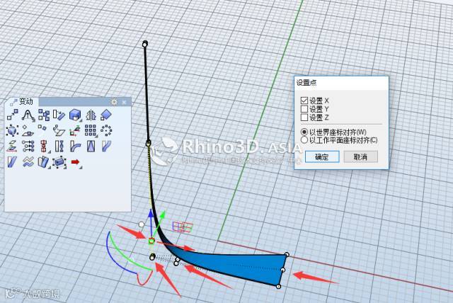 3.打开曲面控制点,可以看见这个曲面是一个弧形面,这里可以用SetPt命令把下面做成直的,也可以不做,看自己喜好吧,我做成直的了;