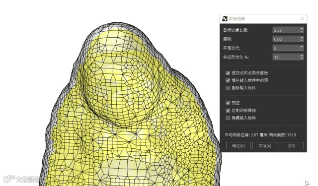 此选项用来控制最终网格边线的理想长度,通常勾选 预览 选项时,会计算输出网格的平均长度值。