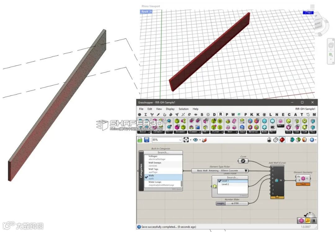 和其他的 Grasshopper 几何运算器一样,最终输出的几何物件会同时显示在 Rhino 与 Revit 的视窗中,如下图所示。