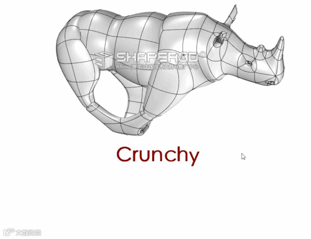 从Rhino 7 WIP (2019-10-09)版本开始对SubD物件新增两种不同的显示模式:Creamy 光滑模式与 Crunchy 方块模式(控制网格),目前提供以下这三个指令供用户使用, Creamy\Crunchy\CreamyCrunchySwap(暂定的名称)。