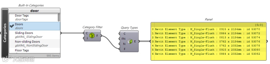 当查询一个 Revit 模型中的自定义类型时,我们可以找到包含每种类型逻辑的自定义族定义,我们使用自定义的 Grasshopper Python 运算器(Type Family)来获取该组件中的每种类型的系列。