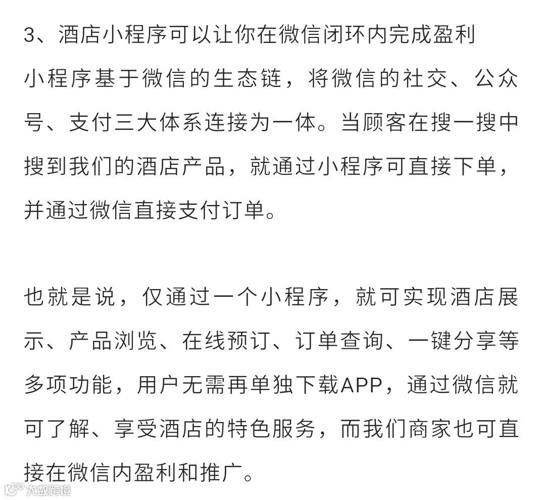 3、而且,各大品牌酒店在服务丰富的综合平台展示有限,只有基本的住房情况,没有突出品牌优势不利于推广,入驻平台费用高,效果却不如人意。如果酒店拥有专属小程序则可以换着花样玩各种营销,做各种品牌形象宣传。