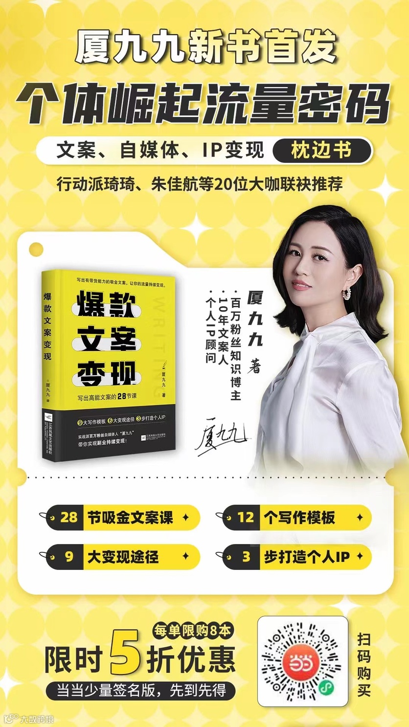 厦九九老师的新书《爆款文案变现》正在热卖中,如果你想在工作、全职妈妈之余,给自己打造一份赚钱的副业,欢迎和我们一起学习爆款文案写作。