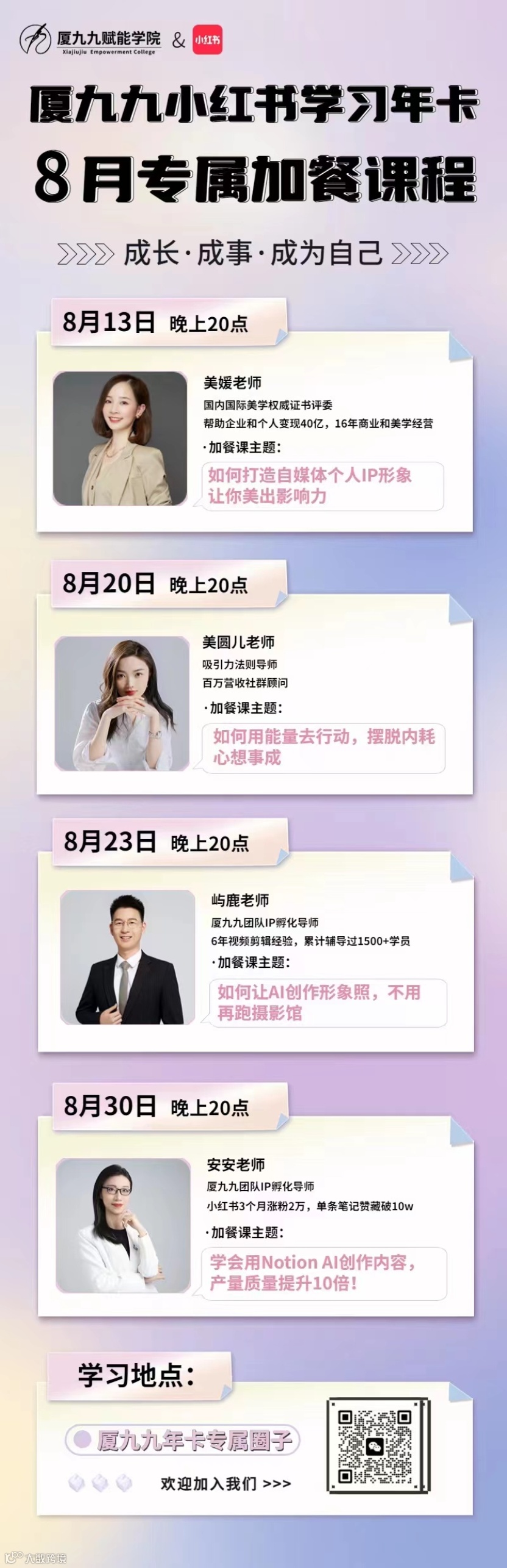 在我们年度营的课程里,不单单只有小红书运营内容的学习,还有个人成长、IP形象打造等整个自媒体创作的方方面面。