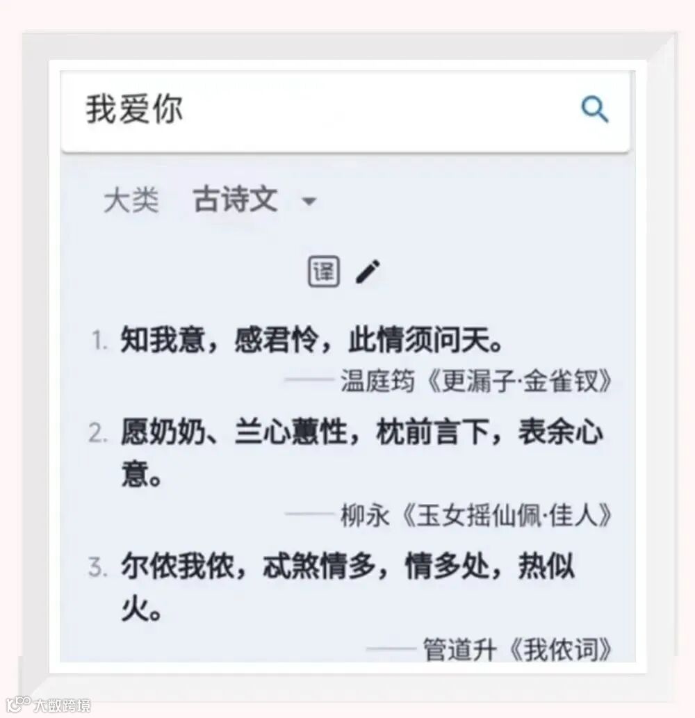 只要输入大概意思的描述,比如“我爱你”,选择古诗文,看看多美的诗词全出来了,还可以选现代名人金句、俗语谚语,以及网络句子电视电视剧台词等。其他找金句的平台都可以丢掉了。