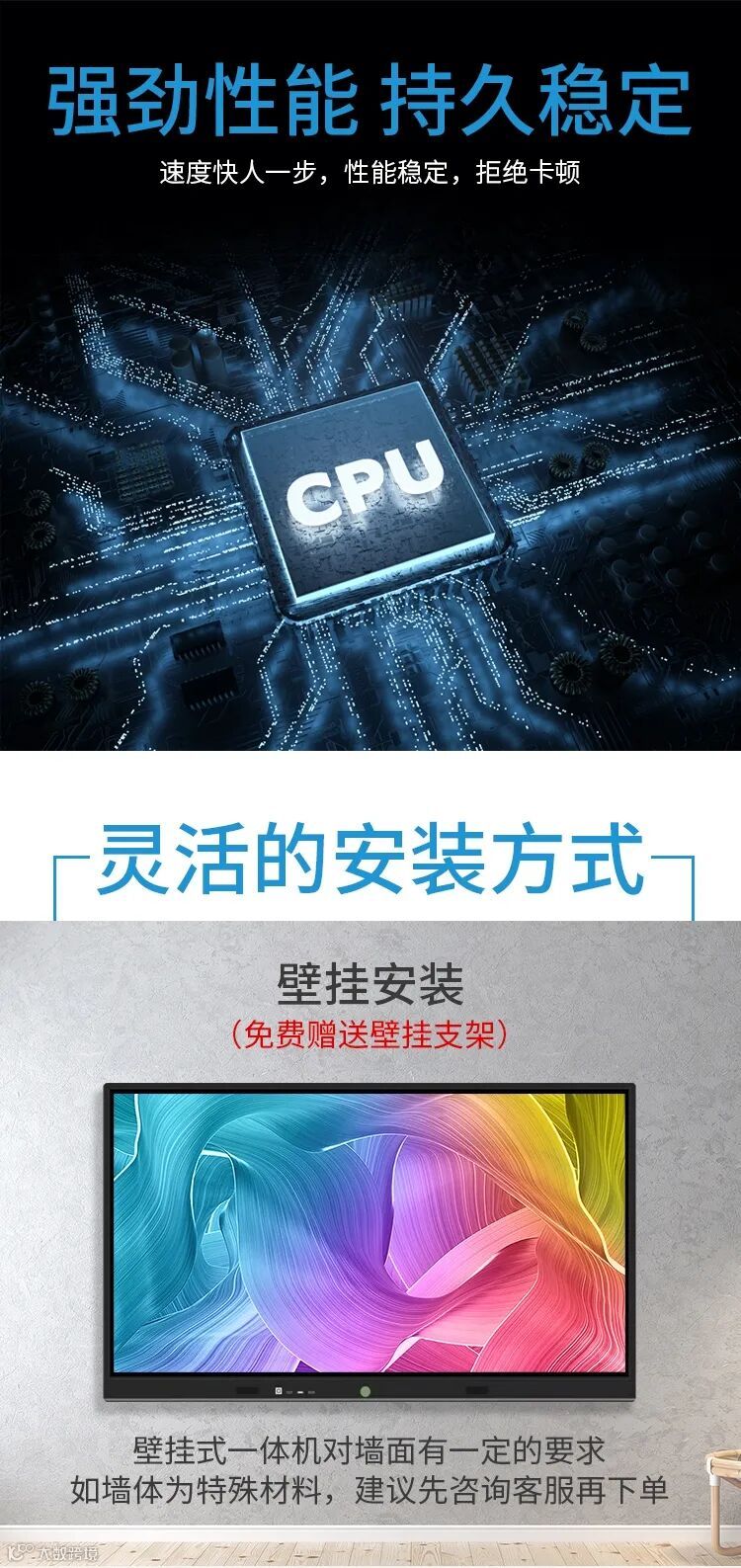 系统上,内置Android及Windows双系统,同时能够自适应调节屏幕亮度,搭配4K超清分辨率,让会议思路清晰可靠,而且搭载强劲高效CPU,拒绝卡顿,让会议顺利进行!