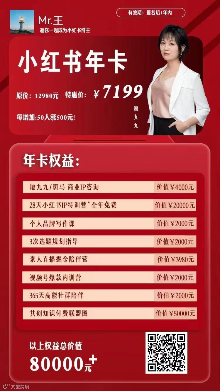 九九老师小红书年卡开课了,快来加入,抓住小红书红利!