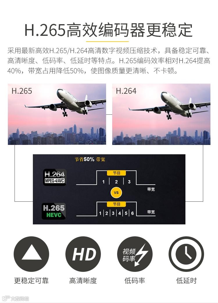元浪直播编码器采用最新高效H.265高清数字视频压缩技术,具备稳定可靠、高清晰度、低码率、低延时等特点。对比H.264解码器,效率提高40%,宽带占用比降低50%,让图像更加清晰,不卡顿。