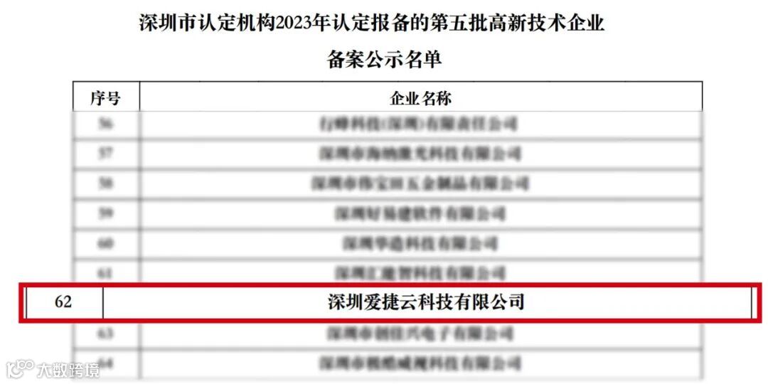 12月25日,高新技术企业认定管理工作网发布了【对深圳市认定机构2023年认定报备的第五批高新技术企业拟进行备案的公示】,经过经企业自评、材料审核、深圳市科技创新委员会专家组现场综合审查,爱捷云顺利通过并获得“国家高新技术企业”认定,正式迈入国家高新技术企业行列。