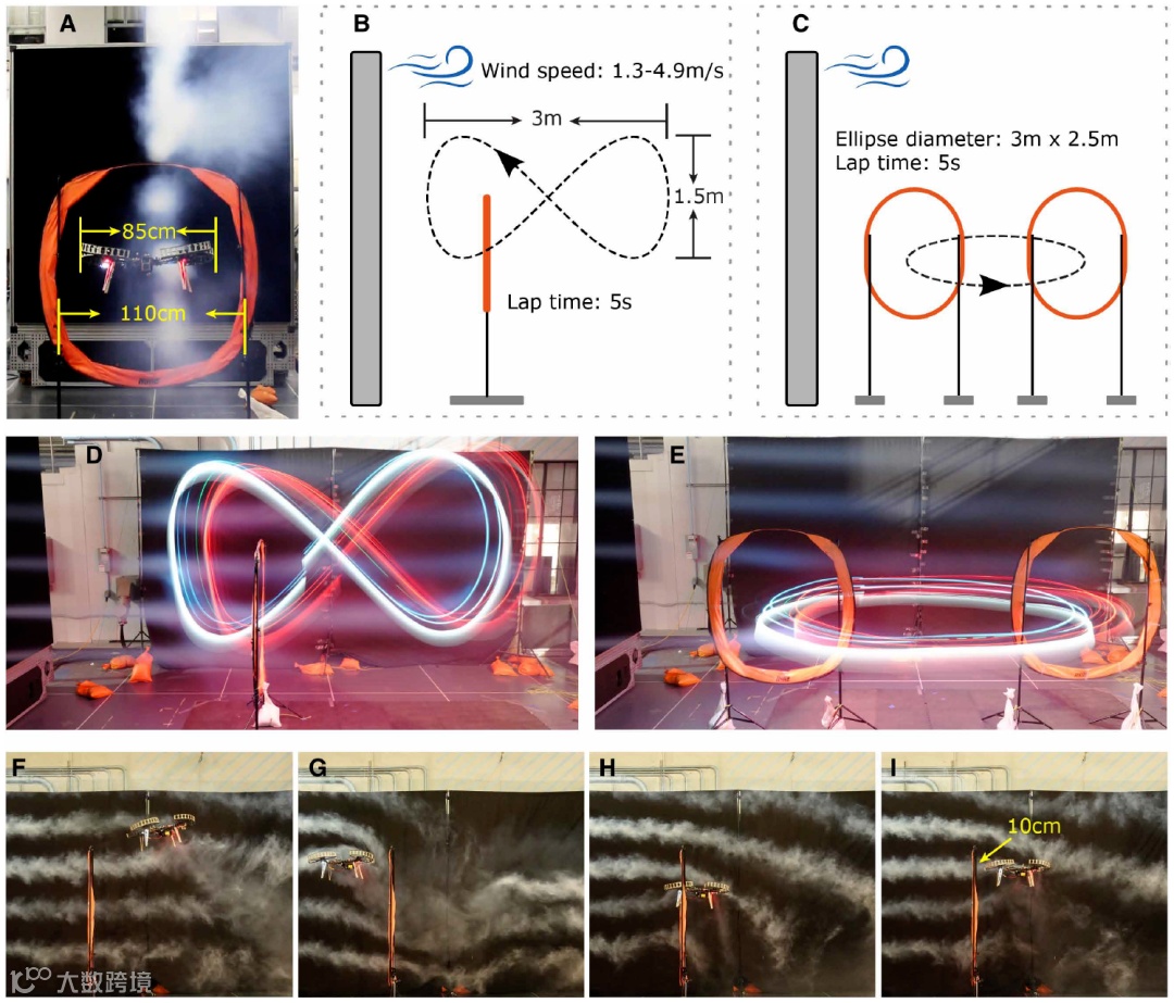 在(C) 中,无人机在水平面上通过两扇大门沿着一个椭圆形飞行,风速为3.1米/秒 (D和E),长曝光照片(曝光时间为5秒),显示两项任务中的一圈。(F到I) 高速照片(快门速度为1/200秒),显示无人机通过大门的瞬间以及无人机与风之间的相互作用。