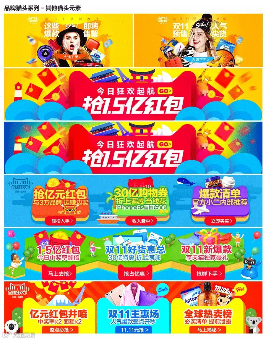 在茫茫图海里,能够让人眼前一亮是我们追求的效果,与其他平台设计形成差异,也是我们的使命!其实在设计之前,我们就希望这次的设计能够区别于以往,有特色,有记忆点。那怎样才能让用户认准我们的双11?你猜得没错,那就是我们品牌的核心元素-猫头!!为了让用户能够强烈感受到品牌,我们就要重复重复再重复的强调!就像脑白金的广告,一日三次,定能给人留下深刻印象,重复