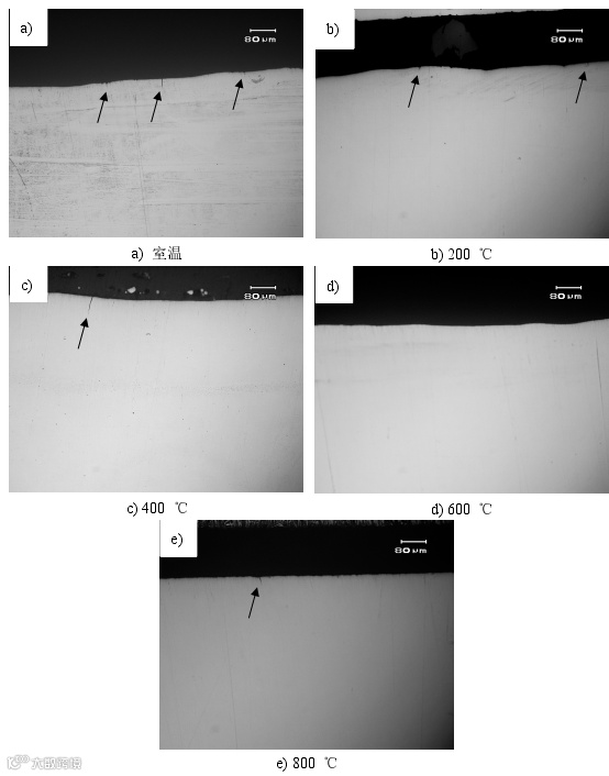 处理时高速弹丸撞击材料表面具有强化材料表层的作用,与此同时所引发的喷丸弱化机制,是在喷丸时由高速弹丸撞击可能引发喷丸表面微裂纹的产生。本节研究喷丸温度对T-48A1-2C-2Nb合金裂纹的影响,如图3-1所示,是合金在不同温度下喷丸后的横截面显微照片,图中黑箭头所指向的就是喷丸处理过程中造成的喷丸表面微裂纹。