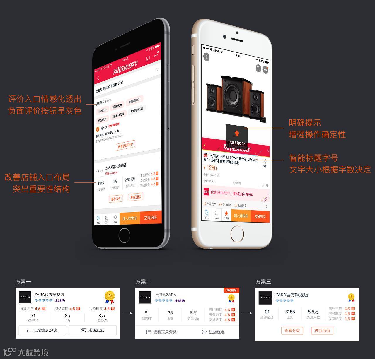 在比如以往所有BU特色业务都汇集到手淘详情页,而特色业务到详情页都是保持非特色展现方式,用户对品牌是没有认知的,他只会记得这个商品,不会记得这个特色品牌。如果从视觉的角度去切入,把品牌透在详情页中展现,用户逛的同时好品质的品牌就会在他脑海里形成印象,使用户有好感,形成良性循环,促使用户经常来特色品牌挑选心怡的宝贝,提高购买率。