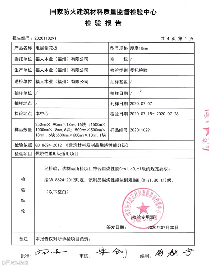 报告显示:福人福州公司生产的18mm阻燃刨花板制品符合燃烧性能C-s1,d0,t1级的规定要求。按GB8624-2012判定该制品燃烧性能达到难燃B1(C-s1,d0,t1)级。这表明福人福州公司已具备批量生产难燃级刨花板的生产能力,为公司拓宽产品市场打下了良好基础。