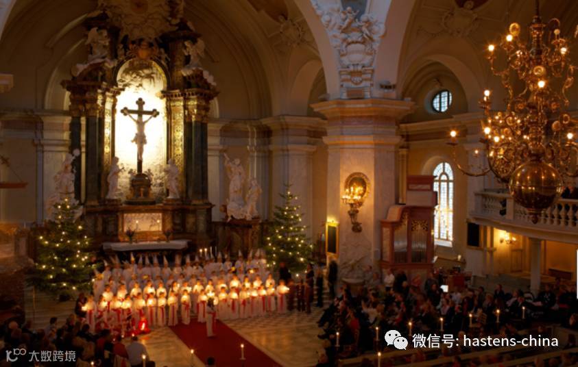 每年12月13日,瑞典的圣诞节便拉开了帷幕。瑞典人认为一年中这一天黑夜最长,只要度过这天,光明会再次普照大地。于是,聪慧的当地人借神话中的光明女神圣露西亚之名,将这天命名为圣露西亚日。当地的教堂、学校、社区等,在每年的这一天都会举行烛光游行唱吟活动。孩子们身穿白色长袍,腰缠红色丝带组成合唱团,被选为“圣露西亚”的姑娘则头戴烛光花冠,带领着其他孩子游行。孩子们一边行走一边吟唱着《圣露西亚之歌》,用光明和温暖驱走邪恶的黑暗。