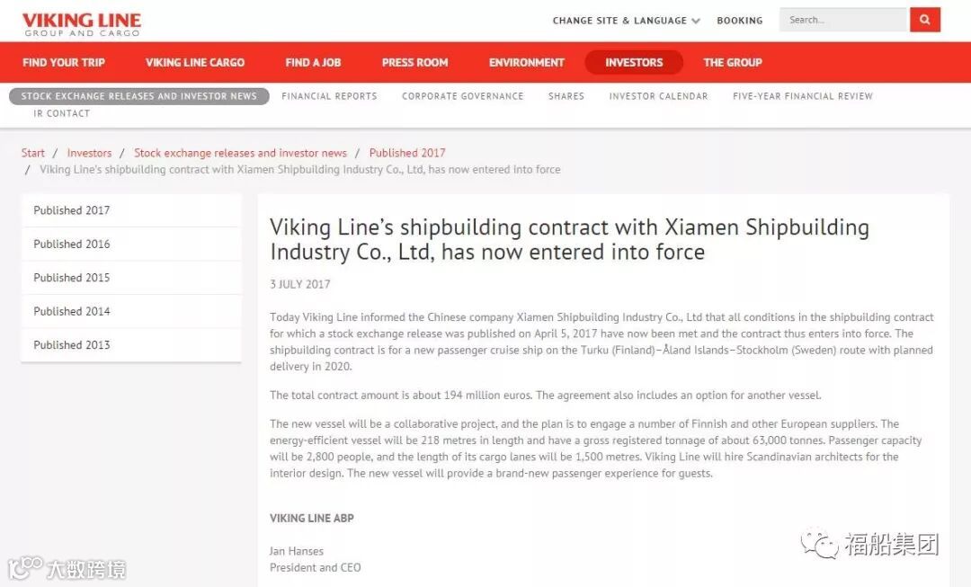 7月3日,厦船重工于2017年4月5日与维京航运公司签订的一艘2800客邮轮型客滚造船合同正式生效。
