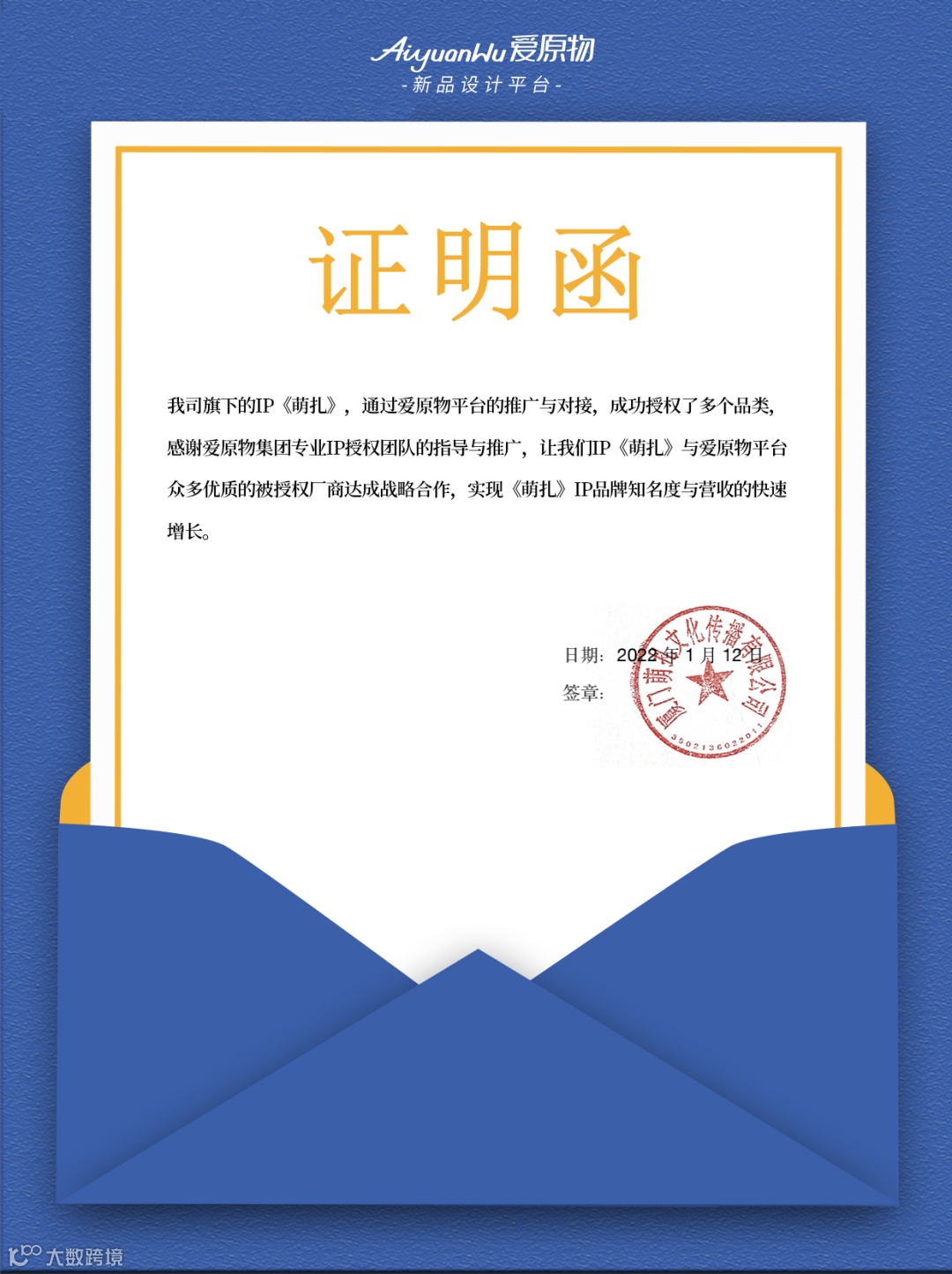 近期客户通过爱原物IP授权,实现IP赋能证明: