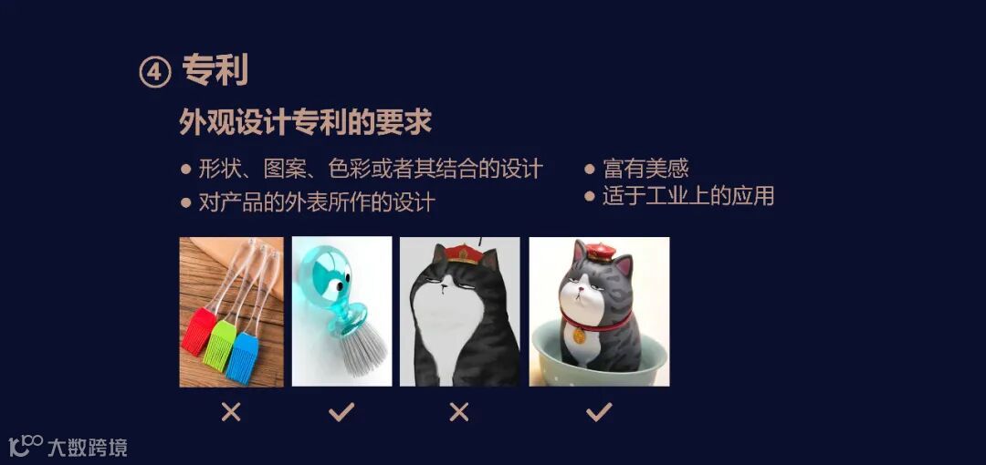 第三个吾皇猫,它不能获得外观设计专利的申请,因为它不是对产品外表所做的设计,它是作为美术作品作为插图来使用,没有运用于工业,所以在条件上不符合外观设计的要求。但如果我们把这个吾皇万睡猫印在产品的外包装,这个时候就发生了性质的改变,此时对这个图案的使用就是适用于工业上的应用,是可以申请外观设计专利来保护。